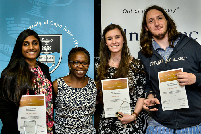 UCT raised a glass to some of its most accomplished young role models at the annual Student Leadership Awards, held in partnership with Investec, on 13 October 2015. Students who showed outstanding leadership abilities in a range of categories were celebrated and encouraged in equal measure on the night. Vice-Chancellor Dr Max Price and keynote speaker Setlogane Manchidi imparted words of both congratulations and trust in the students’ resolve to use their potential to do as much good for society as they could. As in previous years, students from the Faculty of Health Sciences received several awards demonstrating excellence in service to their academic and local communities.