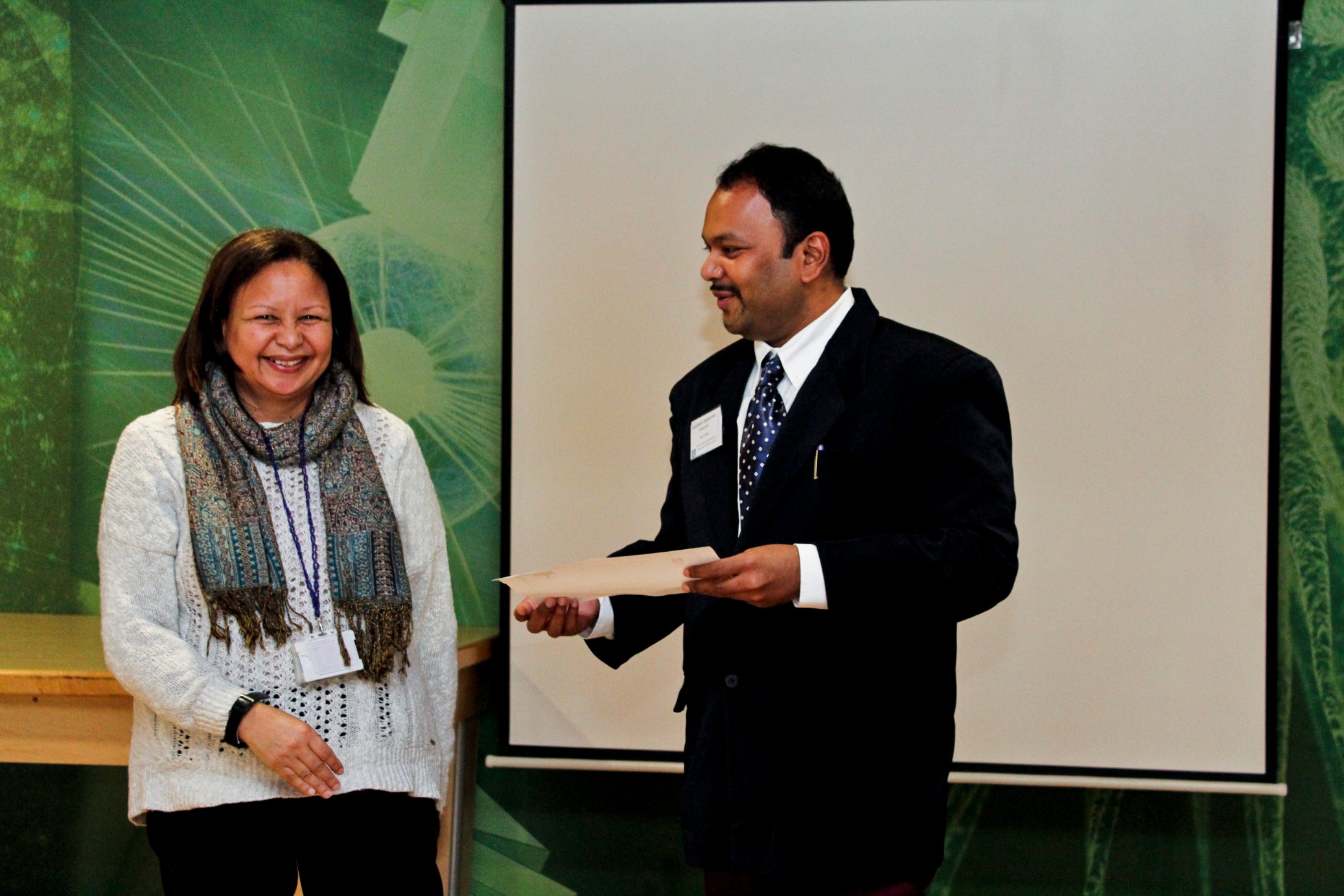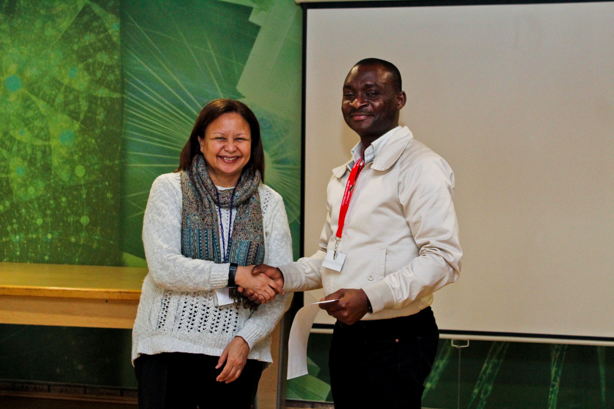 Associate Professor Gonda Perez, Deputy Dean of the Faculty of Health Sciences (left) congratulates Ikechukwu Nwanze, who accepted the prize on behalf of himself and Harsha Kathard & Chioma Ohajunwa on "How can we include disability issues into undergraduate curriculum at UCT"