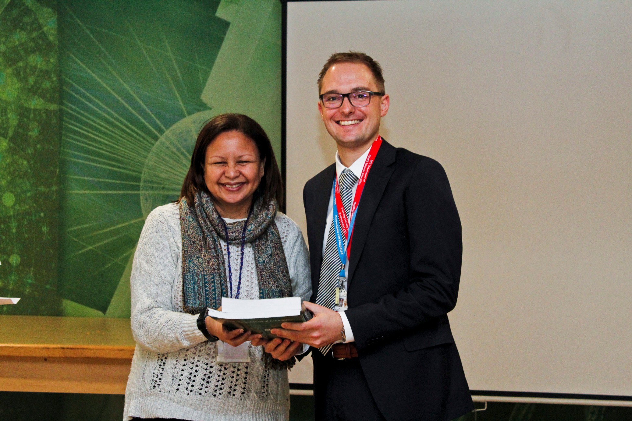 Associate Professor Gonda Perez, Deputy Dean of the Faculty of Health Sciences (left) congratulates Jaisubash Jayakumar on "Innovative Strategies for Enhanced Learning of Immunology