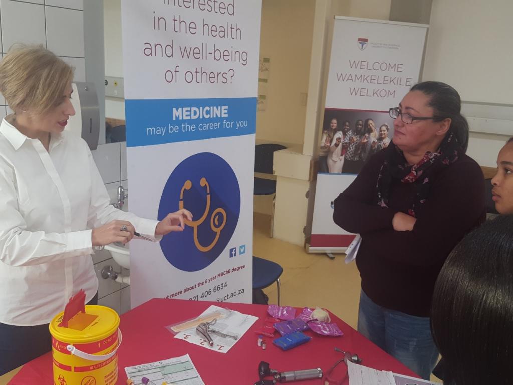Practical activities were incorporated into the different stalls where the use of clinical equipment was demonstrated. An interest in job shadowing was immediately sparked by learners who visited the stalls. The rotations were concluded with a visit to the Emergency Medical Services where paramedics briefed learners about ambulances and their work during emergencies. Educators and learners were very appreciative of the opportunity to attend the Open Day. A teacher reported that all her Gr 12’s who attended last year’s event, applied for admission to an institution for higher education for one of the careers exhibited. UCT will continue to pursue other departments in the health field to partake in future Open Days such as the renal unit and laboratories.