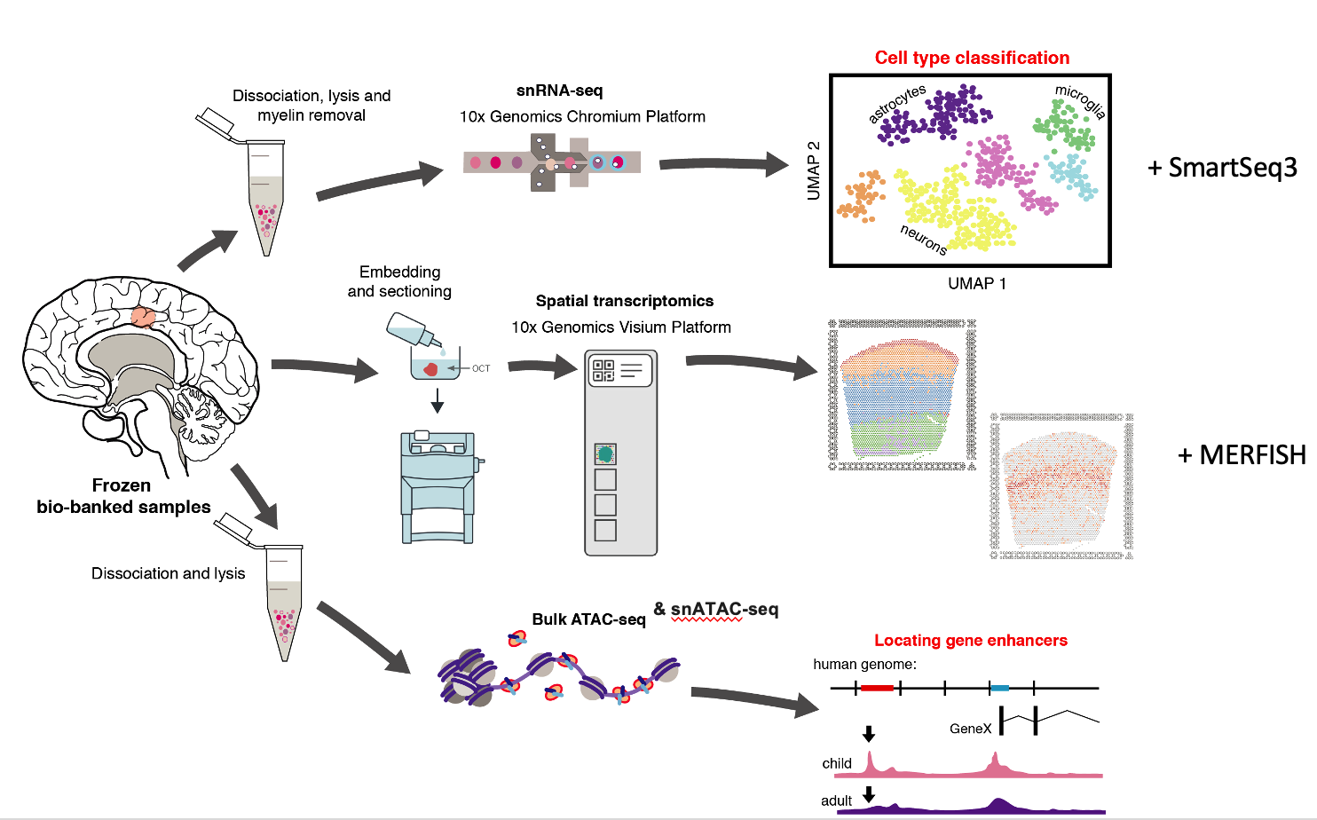 The human brain is a complex assembly of diverse cell types with distinct morphologies and functions. Each cell type has a distinct molecular profile with tightly controlled gene regulatory networks likely in play directing cell differentiation and maintaining correct cell function. This molecular signature is set up over a protracted period of development, which begins in the embryo and continues into adolescence. Is it likely that over the course of a human lifetime, the molecular profile of the mature brain continues to change in response to environmental impacts and the process of ageing. However, due to the scarcity of healthy ante-mortem brain tissue samples, very little is known about how the normal gene expression and gene regulation profiles of the human brain change as it matures, or how this molecular signature is altered in response to environmental challenges, such as infectious disease. Through collaborations with local neurosurgeons we are seeking to address these short-falls in our understanding of the human brain. Using a biobank of human brain tissue obtained during surgery, which encompasses a wide range of ages, we are using single nucleus RNA-seq and ATAC-seq to describe and track the cell-type specific gene regulatory dynamics that occur as the brain matures. Overall, this study will provide a baseline view of the gene regulatory network dynamics that are play as the human brain matures from childhood to adulthood. By focusing on samples collected from a local population , these datasets will form an invaluable resources to local biomedical researchers and medical practitioners, looking to understand how diseases such as TB and HIV impact on the normal functioning of the human brain.