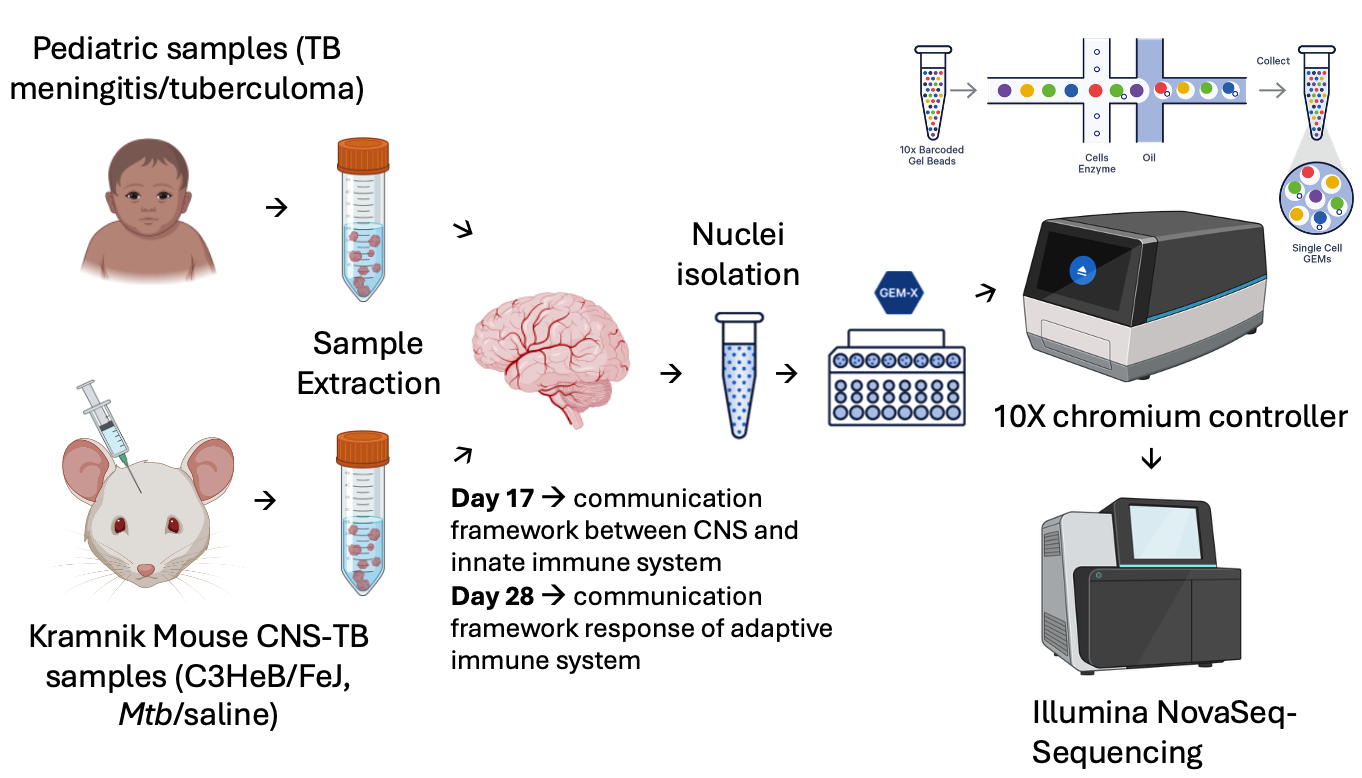 CNS-TB is the most severe extra pulmonary form of the tuberculosis, which can have a fatality rate of up to 80%. Significant barriers to understanding disease pathogenesis exist, which translates to poor diagnosis and treatment outcomes. Improved insight into the cell-type-specific responses to infection in CNS-TB will help us understand the mechanisms associated with the development of CNS-TB and different CNS-TB outcomes. Ultimately this will allow us to develop novel, effective, and broadly accessible therapeutics. In collaboration the African Brain Child group at the Neuroscience Institute and the Experimental Tuberculosis and Immunology Research group in the Institute of Infectious Disease & Molecular Medicine, we are using single cell RNA-seq and spatial transcriptomics approaches to investigate the transcriptional changes induced by M. tuberculosis infection of the brain under clinical and experimental conditions.