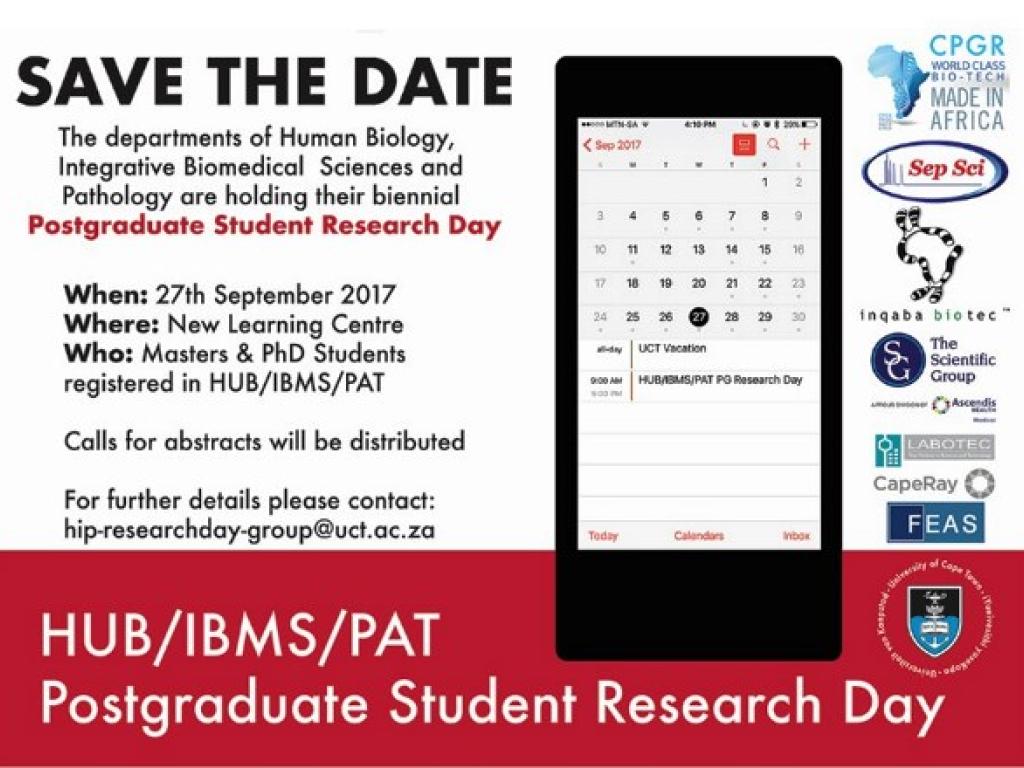 HUB/IBMS/PAT Research Day-27 Sept 2017 Postgraduate student research day The department of Human Biology, Integrative Biomedical Sciences ad Pathology are holding their biennial POSTGRADUATE STUDENT RESEARCH DAY