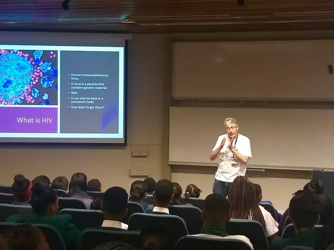 University of Cape Town (UCT) lecturers volunteered to give talks to the students on South African infectious diseases. Phillip Smith began the morning with an important lecture on HIV Awareness, asking the learners what they would want from adolescent HIV care. Head of the DOI, Professor Clive Gray followed with his presentation on HIV and immunology which reiterated the ways in which HIV can be infectious. A/Prof. Reto Guler presented the basics of immunology and on statins as host-directed drug therapy for TB. Julius Chia taught the pupils about the origin of Listeriosis infections, while Tiroyaone Bogale spoke about the brain and how stress effects it during learning and exam periods. The lectures where then wrapped up by Michelle Fisher from SATVI who raised awareness about TB and how important treatment compliance is.