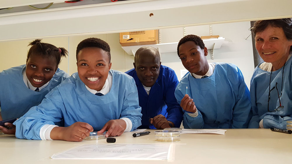 The day began with 93 enthusiastic school learners from Heathfield (Retreat), Lavender Hill, Sinenjongo (Joe Slovo), Uxolo (Khayelitsha) and Masiyile (Khayelitsha) busing in from their areas to arrive at the Institute of Infectious Disease and Molecular Medicine (IDM). The IDM was a kind sponsor for transport and consumables for the day’s activities.