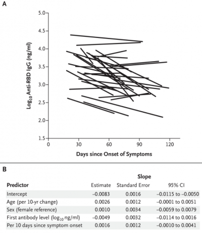 Longitudinal Assessment of Anti–SARS-CoV-2 Receptor-Binding Domain IgG in Persons Who Recovered from Covid-19. (A) Shows log-transformed IgG concentrations plotted against the time since the onset of symptoms in each participant (n=34). (B) Shows a linear regression model that was created to estimate the effects of the participants’ age and sex, the days from symptom onset to the first measurement, and the first measured log10 antibody level on the slope reflecting the change in anti-RBD antibody levels (in log10 ng per milliliters per day). CI denotes confidence interval. (Source: Ibarrondo et al., 2020. NEJM)