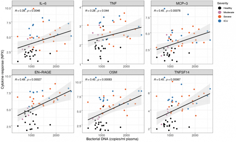 What causes mild or severe COVID-19? A recent paper in Science used a systems biology approach to determine host immune responses to COVID-19 using an array of cellular and molecular procedures. On initial immune cell screening, the authors found an increase in plasmablasts and effector CD8 T cells in the peripheral blood and a decrease in the frequency of plasmacytoid dendritic cells. There was also a marked reduction in the ability of monocytes and myeloid DCs to produce IL-6, TNF-α and IL-1β after being stimulated with TLR ligands, indicating an impaired pro-inflammatory innate response in blood leukocytes of patients with COVID-19. Genes encoding for pro-inflammatory cytokines, as well as HLA-DR expression in myeloid cells, were also reduced. Of note, was the enhanced levels of plasma levels of EN-RAGE, TNFSF14 and OSM which correlated with the clinical severity of disease. However, in agreement with the cellular data, gene expression of both TNFSF14 and OSM were down-regulated in PBMCs from COVID-19 patients with severe disease. It is therefore likely that the plasma pro-inflammatory cytokines originate from the cells in lung tissue rather than from peripheral blood cells. The positive correlation of plasma levels of bacterial DNA and lipopolysaccharide (LPS, derived from gram negative bacteria) with the plasma levels of EN-RAGE, TNFSF14, OSM and IL-6 would support the notion that lung damage is the origin of the bacterial products that triggers a tissue-origin of hyperinflammation leading to severe COVID-19.