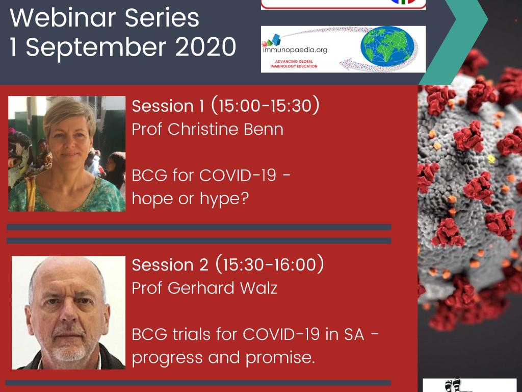 This webinar, co-hosted by South African Immunology Society (SAIS) and Immunopaedia featured talks by Prof Christine Benn on “BCG for COVID-19 - hope or hype?” & Prof Gerhard Walz on “BCG trials for COVID-19 in SA - progress and promise.”
