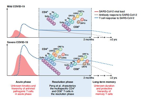 Peng et al. studied the resolution phase of COVID-19 (blue box), showing a broadly targeted CD4+ and CD8+ T cell response (cell colors and numbers represent relative frequencies of indicated protein specificities). The total T cell response (solid blue line) is stronger and broader in severe cases (assumed to have had higher viral burden, red curve), correlating with stronger antibody responses (solid gray line). However, there are, proportionally, more CD8+ T cells in mild disease. Central questions arising from this study (listed in red) concern the unknown hierarchy and kinetics of T cells (dashed blue lines) and antibodies (dashed grey lines) in the acute and memory phases. (Source: Swadling & Maini 2020 Nat Immunology)
