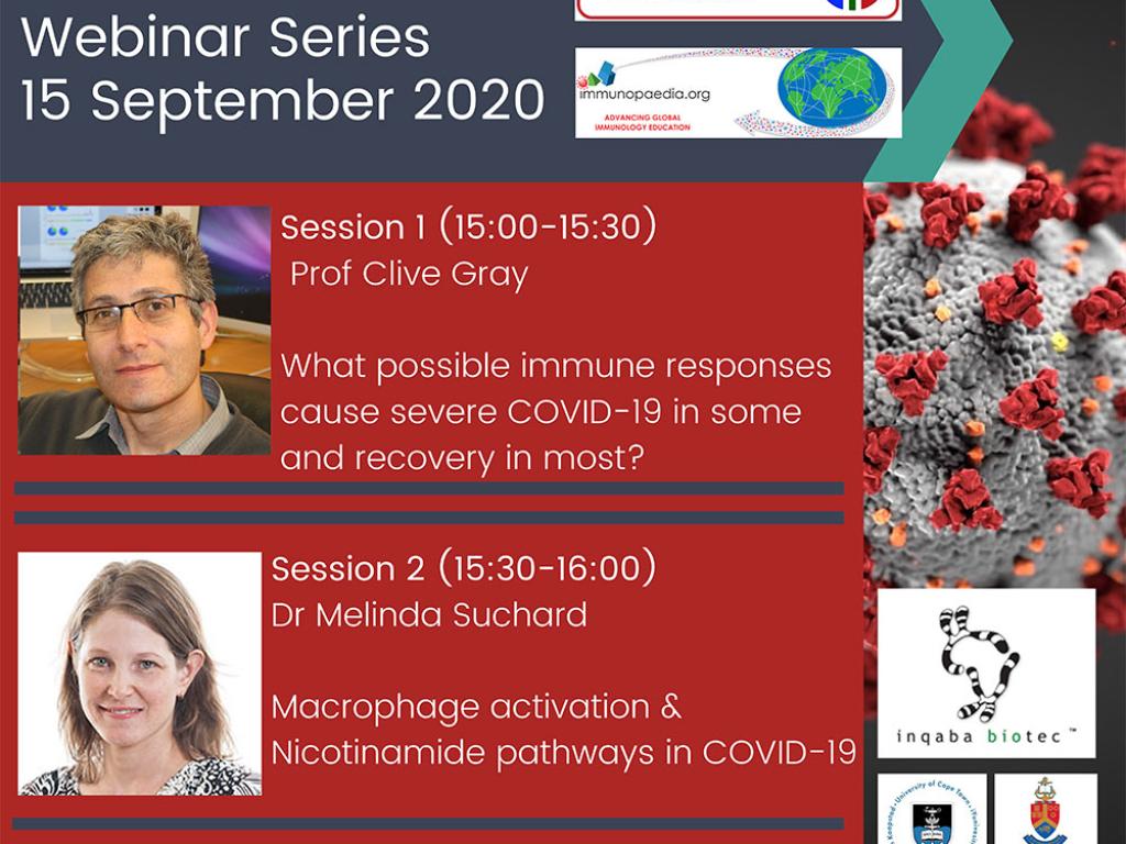 The South African Immunology Society (SAIS) in collaboration with Immunopaedia hosted a webinar that featured talks by Head of the Division of Immunology Prof Clive Gray and Dr Melinda Suchard on “What possible immune responses causes severe COVID-19 in some and recovery in most? “ and “Macrophage activation and Nicotinamide pathways in COVID-19”