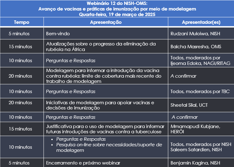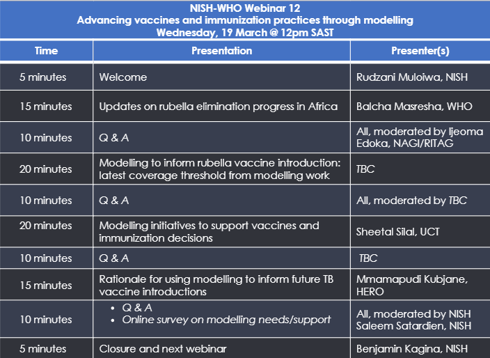 The NITAG Support Hub (NISH) at the University of Cape Town (UCT), in collaboration with the World Health Organization (WHO) and IVIR-AC, is hosting a webinar to explore key topics on Evidence-Informed Decision-Making (EIDM) for vaccines and immunization, with a focus on Advancing vaccines and immunization practices through modelling.
