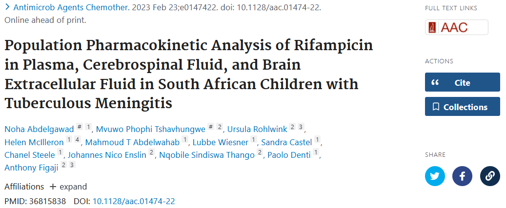 The publication titled “Population Pharmacokinetic Analysis of Rifampicin in Plasma, Cerebrospinal Fluid, and Brain Extracellular Fluid in South African Children with Tuberculous Meningitis” and published in the Antimicrobial Agents and Chemotherapy journal can be found here.