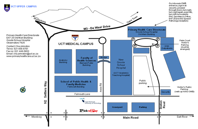 Take the M3 Muizenburg highway from central Cape Town, pass 3 Woodstock turnoffs, stay in the left lane, take the Hospital turn-off, at Main Road turn right, turn first right into Anzio Road, turn first right into the UCT Academic Teaching Hospital, 1st left at the stop street, pass security, go all the way up the hill to the 2nd security stop, go through security and park in the Visitors Parking in Palm Court outside the Old Main Building. If visitors parking has not been arranged for you security will direct you to the visitors parking at the bottom of the hill. Come into the main entrance of the building and security will direct you to the Primary Health Care Directorate (see directions above).