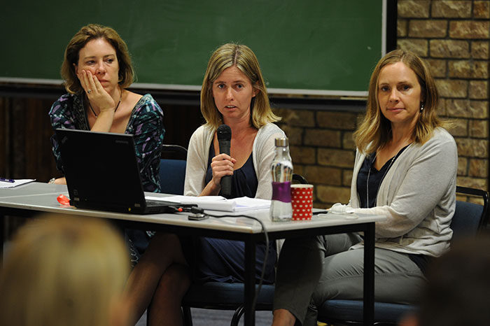 (From left) Sarah Crawford-Browne, Gem Patten and Dr Kathryn Stinson speaking at a health sciences seminar on Ebola. (Photo by Michael Hammond.)
