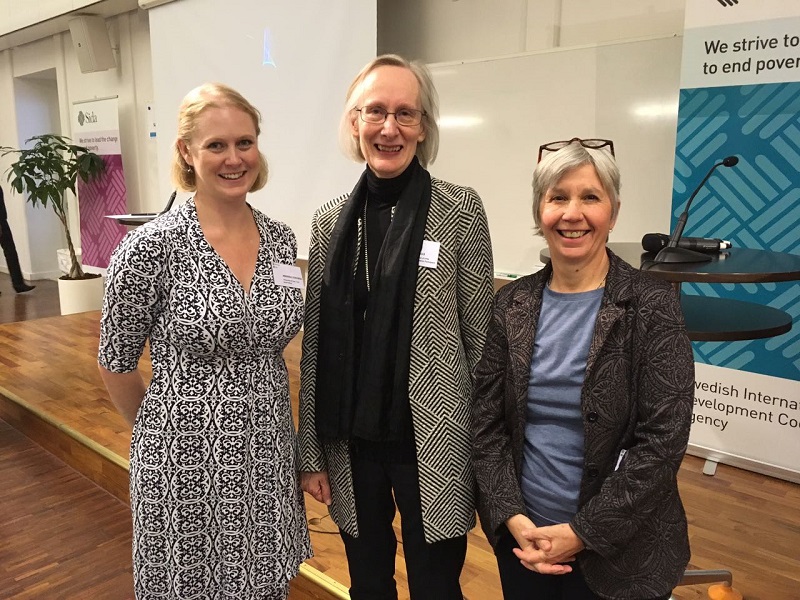 Amanda Edwards (left) presenting the winning essay in Sweden – standing with Prof Lucy Gilson (right) and Prof Anne Mills (middle)