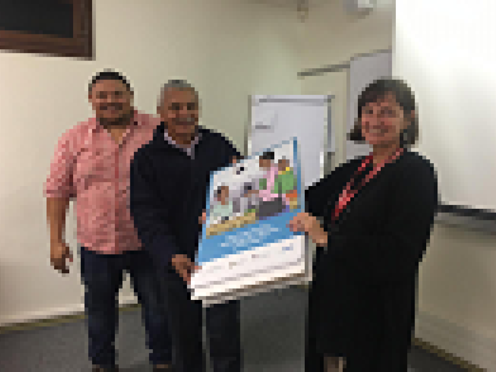 On 03 May, 2019 Professor Hanna-Andrea Rother, Head of the Environmental Health Division in the School of Public Health and Family Medicine, handed over the prototype of a flip chart developed by her Street Pesticide project to the City of Cape Town (CCT) Environmental Health representatives Armien Petersen (Co-ordinator Environmental Health, CCT) and Elroy Plaatjies (Principal Environmental Health Practitioner, Khayelitsha Sub District, CCT).