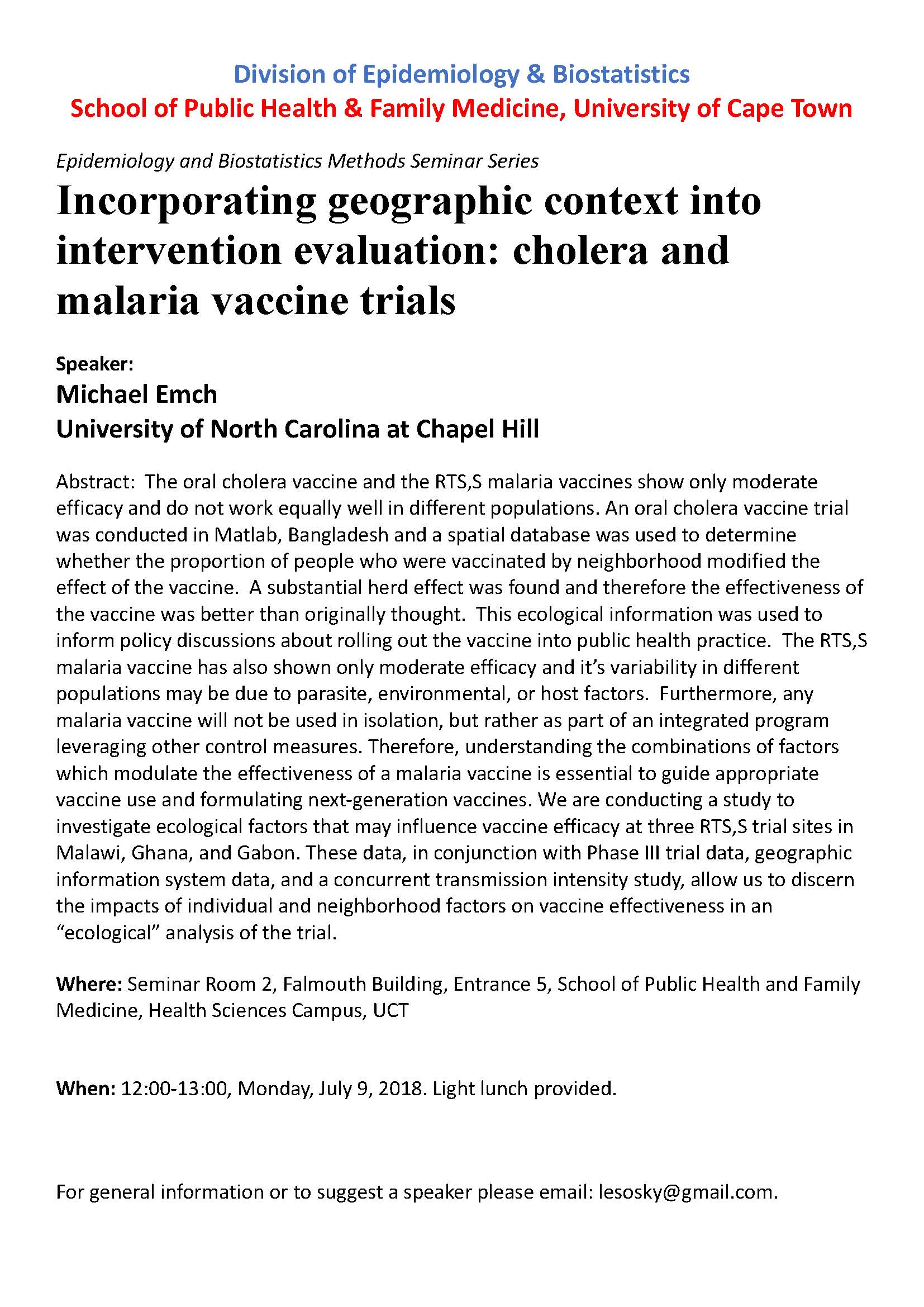 9 July 2018 Seminar Room 2, Falmouth Building Maia Lesosky "Incorporating geographic context into intervention evaluation: cholera and malaria vaccine trials" Michael Emch University of North Carolina at Chapel Hill